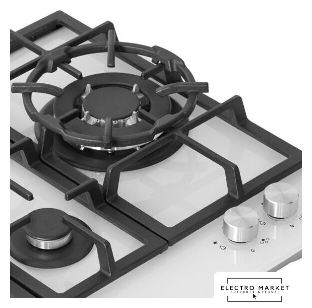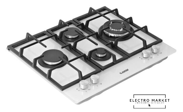 газовая на 4 конфорки, закаленное стекло, мощность: 8200 Вт, автоматический электроподжиг, газ-контроль, решетки: чугун, размеры (ШхГ): 59x51.5 см