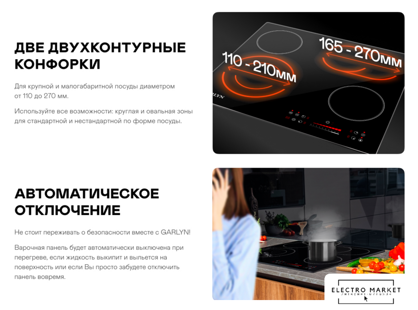 | Подробная информация о конфорках | Размеры конфорокЛевая верхняя конфорка - 165 мм; Левая нижняя конфорка - 145/230 мм; Правая верхняя конфорка - 165/270 мм; Правая нижняя конфорка – 165 ммМощность конфорокЛевая верхняя конфорка - 1200 Вт; Левая нижняя конфорка - 1100/2200 Вт; Правая верхняя конфорка - 1100/2000 Вт; Правая нижняя конфорка – 1200 Вт |