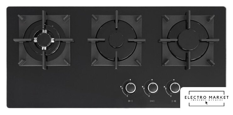 газовая на 3 конфорки, закаленное стекло, мощность: 5950 Вт, автоматический электроподжиг, газ-контроль, решетки: чугун, независимая установка, размеры (ШхГ): 45x52.5 см
