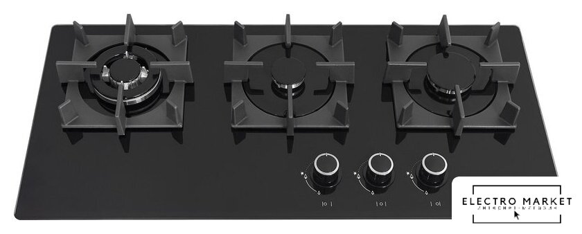 газовая на 3 конфорки, закаленное стекло, мощность: 5850 Вт, автоматический электроподжиг, газ-контроль, решетки: чугун, независимая установка, размеры (ШхГ): 73.3x50 см