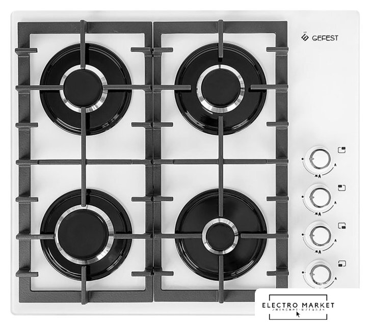 газовая на 4 конфорки, закаленное стекло, автоматический электроподжиг, газ-контроль, решетки: чугун, независимая установка