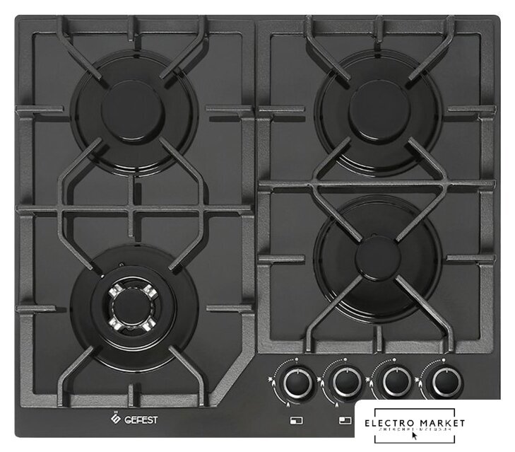 газовая на 4 конфорки, закаленное стекло, мощность: 8650 Вт, автоматический электроподжиг, газ-контроль, решетки: чугун