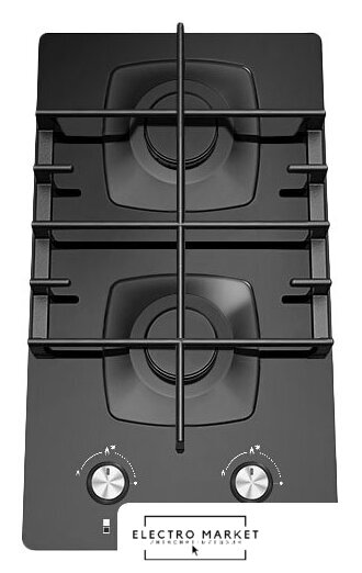 газовая на 2 конфорки, закаленное стекло, мощность: 4400 Вт, автоматический электроподжиг, газ-контроль, решетки: чугун, независимая установка, размеры (ШхГ): 30x51 см
