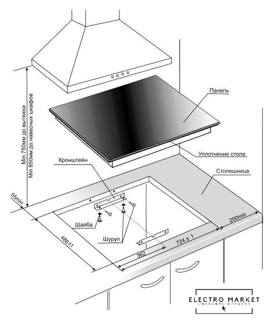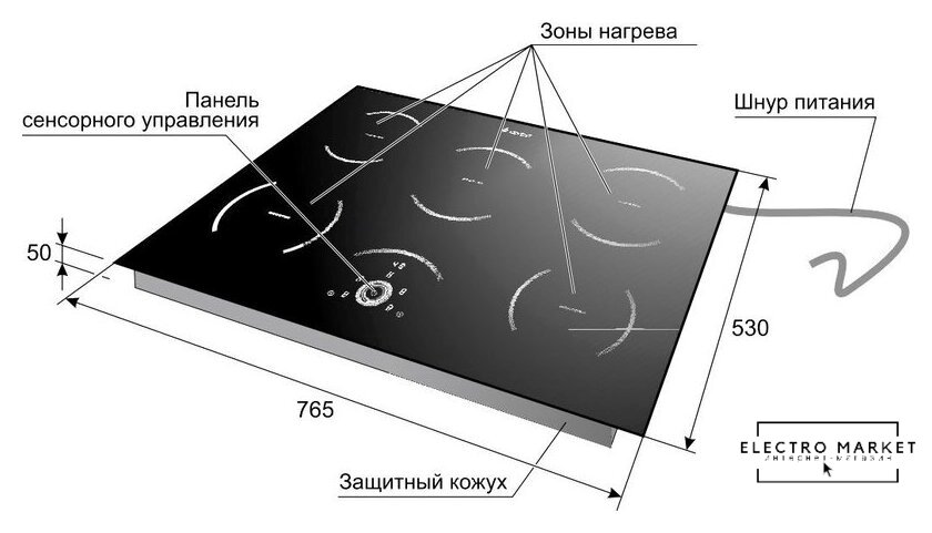 индукционная на 4 конфорки, закаленное стекло, мощность: 7350 Вт, независимая установка, размеры (ШхГ): 58x51 см