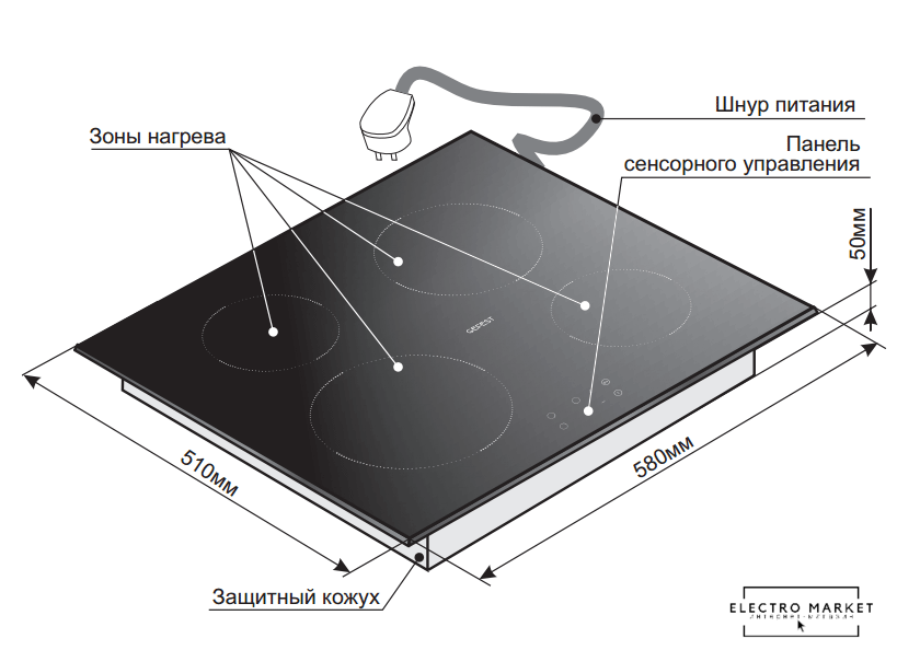 индукционная на 4 конфорки, cтеклокерамика, мощность: 7400 Вт, независимая установка, размеры (ШхГ): 59x52 см
