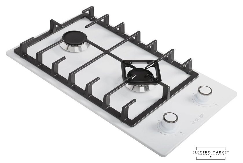 газовая на 2 конфорки, закаленное стекло, мощность: 4200 Вт, газ-контроль, решетки: чугун, независимая установка, размеры (ШхГ): 29x50 см