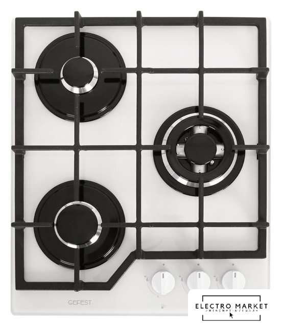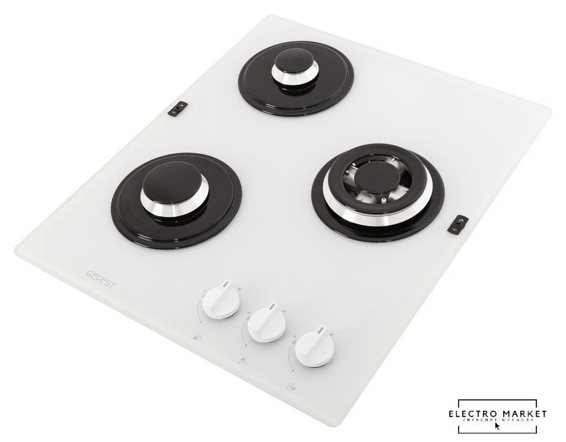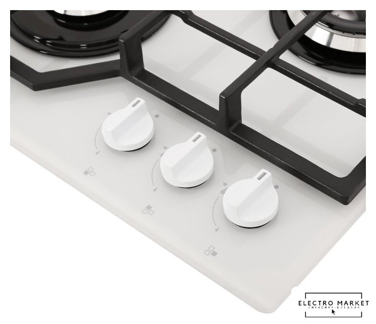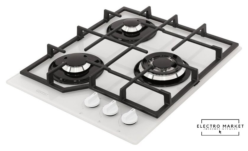 газовая на 3 конфорки, закаленное стекло, мощность: 5900 Вт, автоматический электроподжиг, газ-контроль, решетки: чугун, независимая установка, размеры (ШхГ): 46x52 см