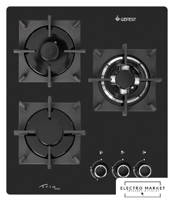 газовая на 3 конфорки, закаленное стекло, мощность: 6550 Вт, автоматический электроподжиг, газ-контроль, решетки: чугун, независимая установка, размеры (ШхГ): 46x51 см