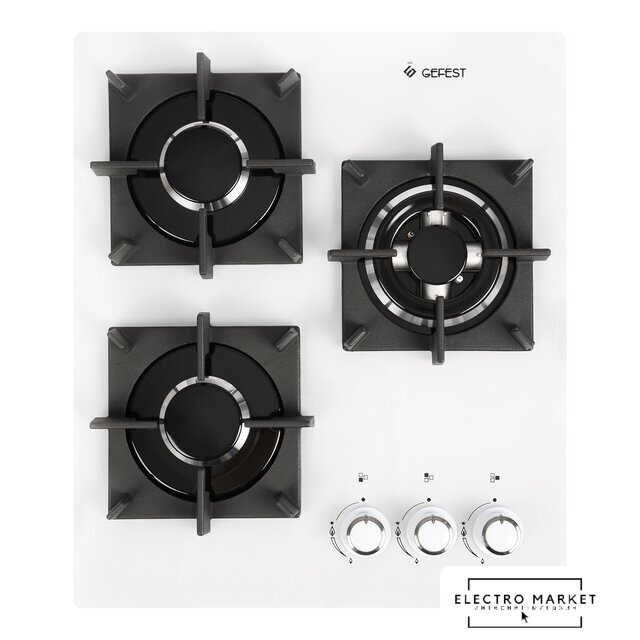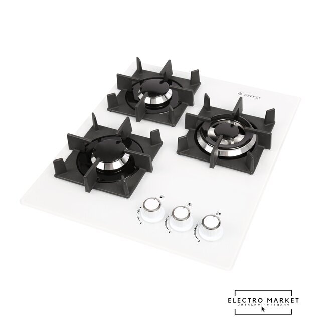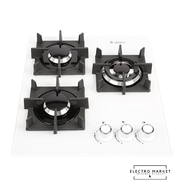 газовая на 3 конфорки, закаленное стекло, мощность: 6230 Вт, автоматический электроподжиг, газ-контроль, решетки: чугун, независимая установка, размеры (ШхГ): 45.5x51 см