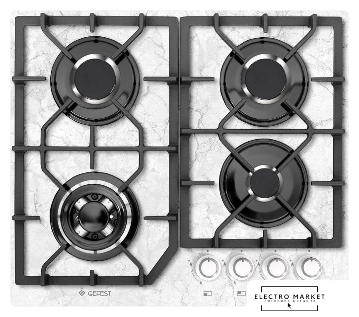 газовая на 4 конфорки, закаленное стекло, мощность: 8300 Вт, автоматический электроподжиг, газ-контроль, решетки: чугун, независимая установка, размеры (ШхГ): 58.4x51.4 см