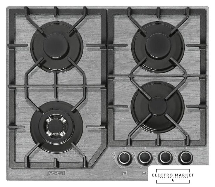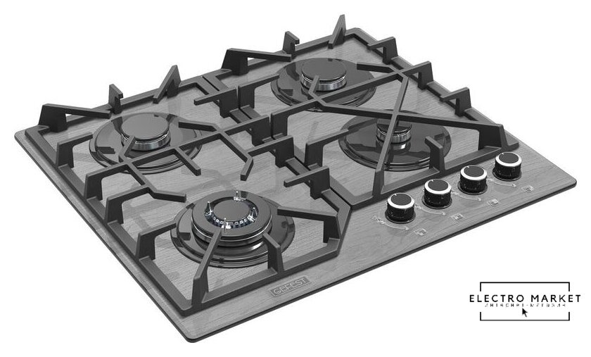 газовая на 4 конфорки, закаленное стекло, мощность: 8650 Вт, автоматический электроподжиг, газ-контроль, решетки: чугун