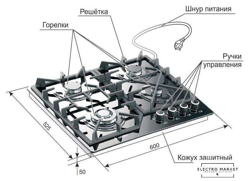 газовая на 4 конфорки, закаленное стекло, мощность: 8000 Вт, автоматический электроподжиг, газ-контроль, решетки: чугун, размеры (ШхГ): 60x52 см