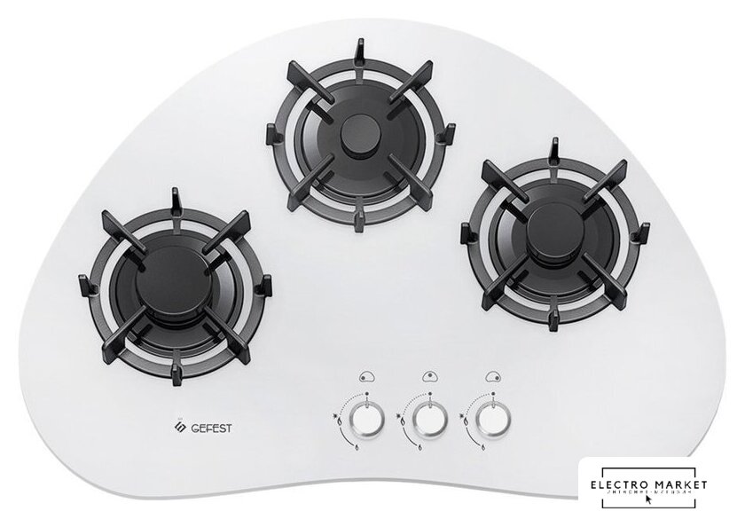 газовая на 3 конфорки, закаленное стекло, мощность: 5950 Вт, автоматический электроподжиг, газ-контроль, решетки: чугун, независимая установка, размеры (ШхГ): 75x35 см