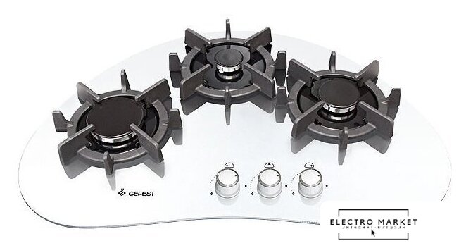 газовая на 3 конфорки, закаленное стекло, мощность: 5950 Вт, автоматический электроподжиг, газ-контроль, решетки: чугун, независимая установка, размеры (ШхГ): 45x52.5 см