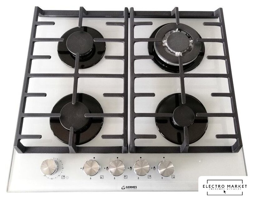 газовая на 4 конфорки, закаленное стекло, мощность: 8650 Вт, автоматический электроподжиг, газ-контроль, решетки: чугун