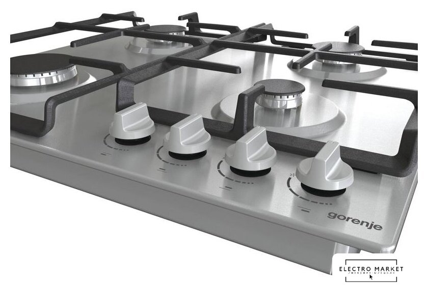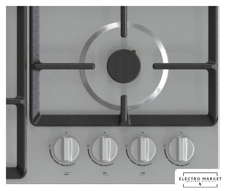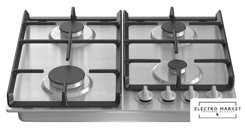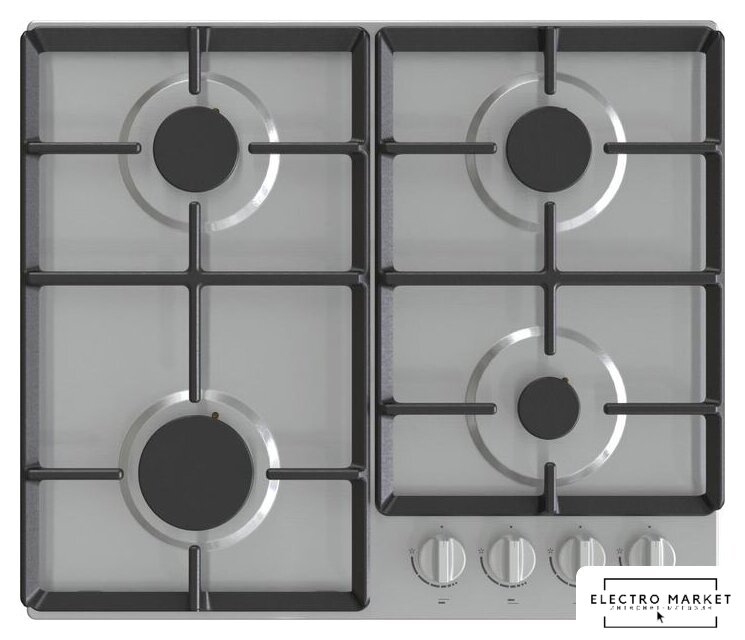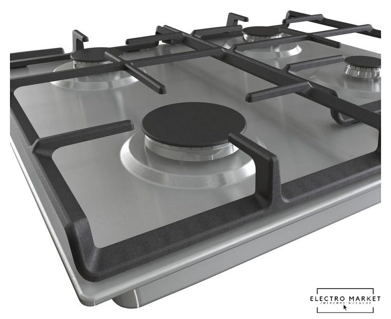 газовая на 4 конфорки, нержавеющая сталь, мощность: 8800 Вт, автоматический электроподжиг, газ-контроль, решетки: чугун, размеры (ШхГ): 59.5x51 см