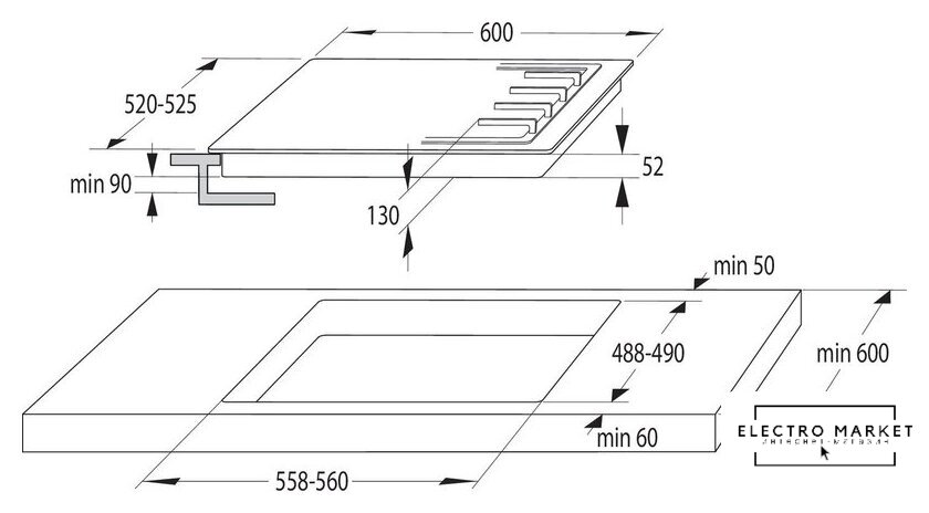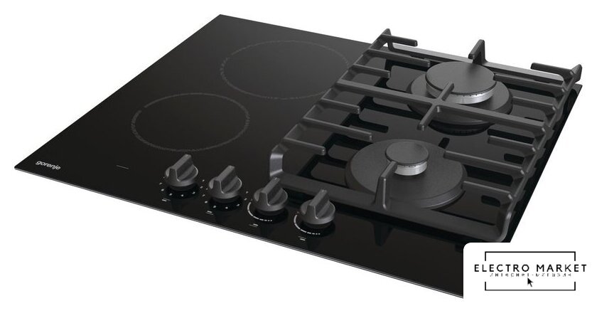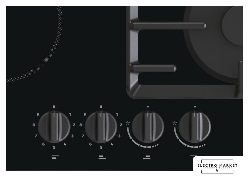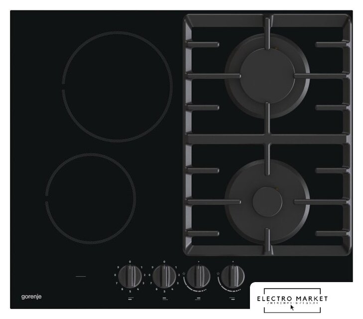 HiLight + газ на 4 конфорки, cтеклокерамика, автоматический электроподжиг, газ-контроль, решетки: чугун, независимая установка, размеры (ШхГ): 58.5x51 см