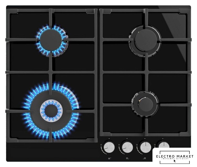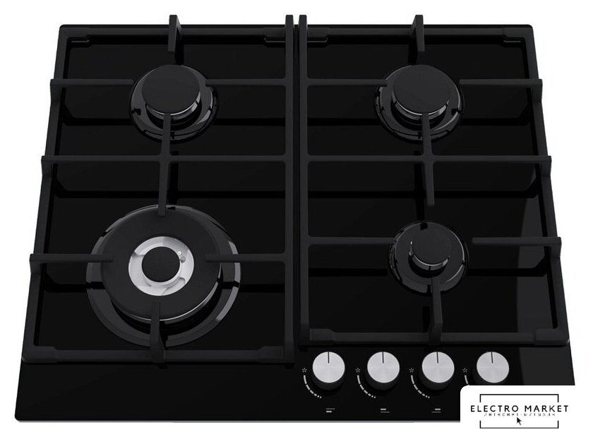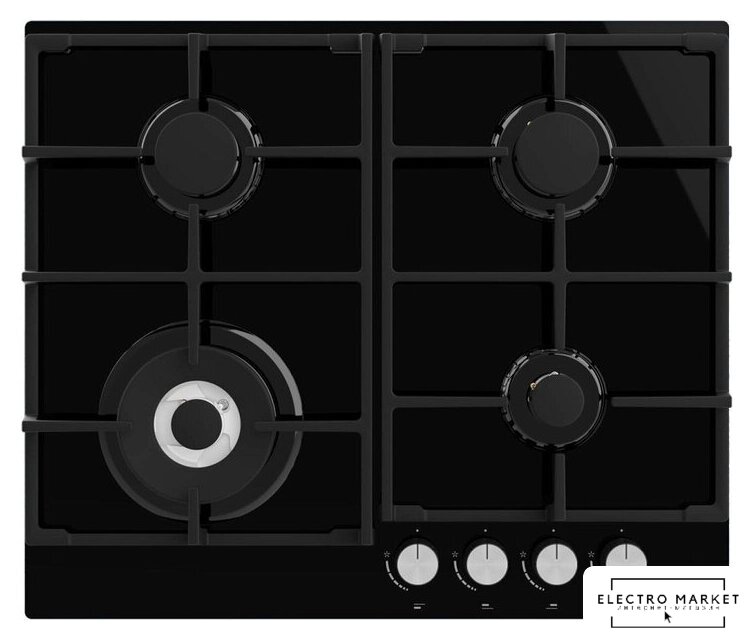 газовая на 4 конфорки, закаленное стекло, мощность: 7500 Вт, автоматический электроподжиг, газ-контроль, решетки: чугун, независимая установка, размеры (ШхГ): 59x51 см