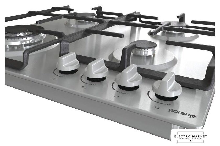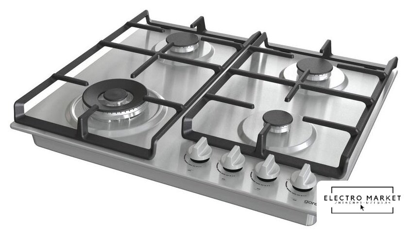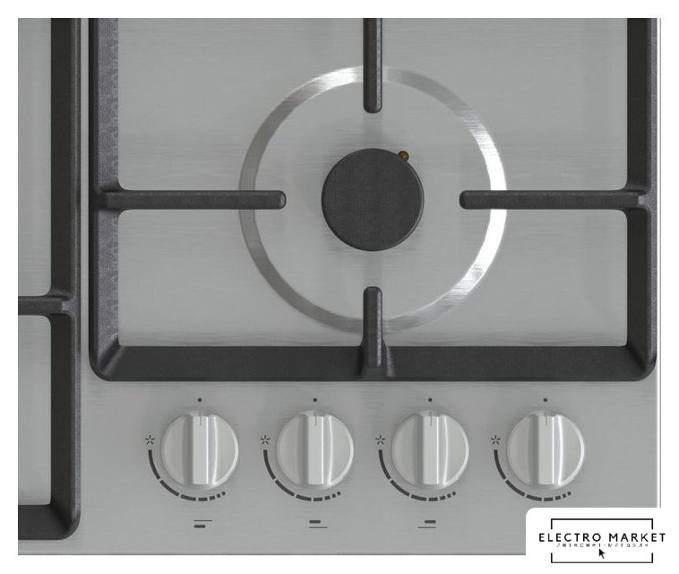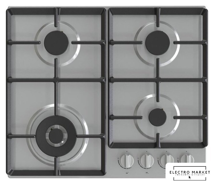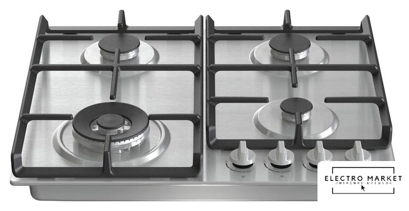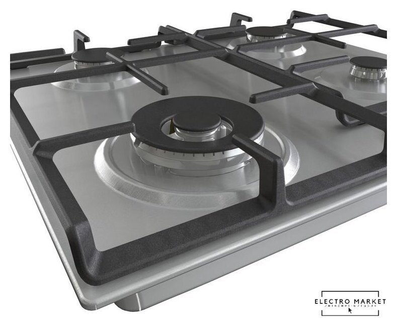 газовая на 4 конфорки, нержавеющая сталь, мощность: 7300 Вт, автоматический электроподжиг, газ-контроль, решетки: чугун, размеры (ШхГ): 58x50 см
