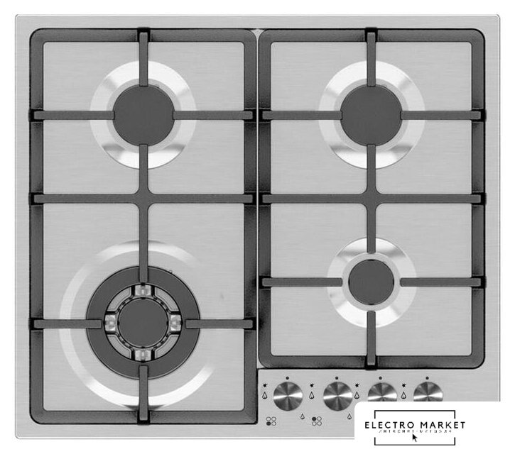 газовая на 4 конфорки, закаленное стекло, мощность: 9100 Вт, автоматический электроподжиг, газ-контроль, решетки: чугун, независимая установка, размеры (ШхГ): 59x51.5 см