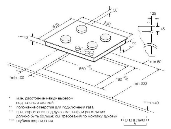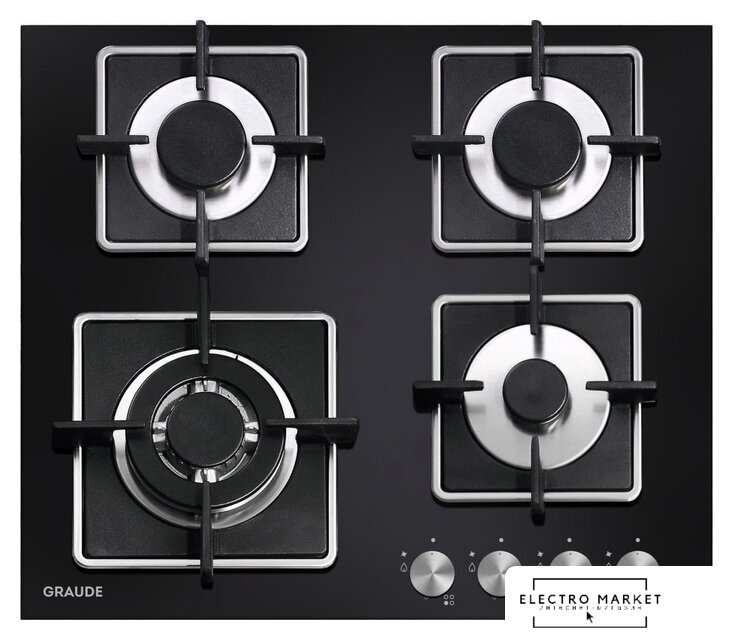 газовая на 4 конфорки, закаленное стекло, мощность: 8500 Вт, автоматический электроподжиг, газ-контроль, решетки: чугун, независимая установка, размеры (ШхГ): 60x52 см