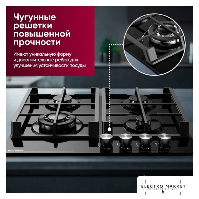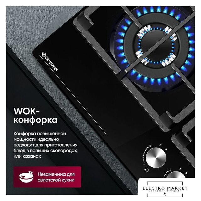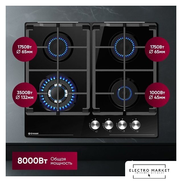 | Подробная информация о конфорках | Одна WOK-конфорка мощностью 3500 Вт (диаметр 132 мм), две универсальные конфорки по 1750 Вт (диаметр 65 мм), одна малая конфорка 1000 Вт (диаметр 45 мм) |