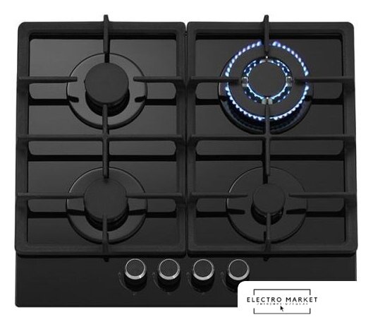 газовая на 4 конфорки, закаленное стекло, мощность: 7650 Вт, автоматический электроподжиг, газ-контроль, решетки: чугун, независимая установка, размеры (ШхГ): 58.5x51 см