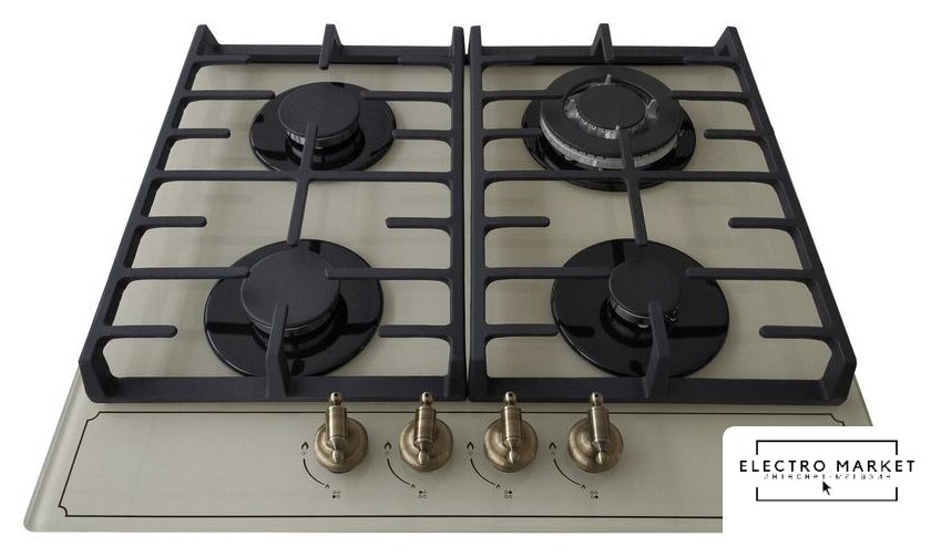 газовая на 4 конфорки, закаленное стекло, мощность: 7650 Вт, автоматический электроподжиг, газ-контроль, решетки: чугун, независимая установка, размеры (ШхГ): 58.5x51 см