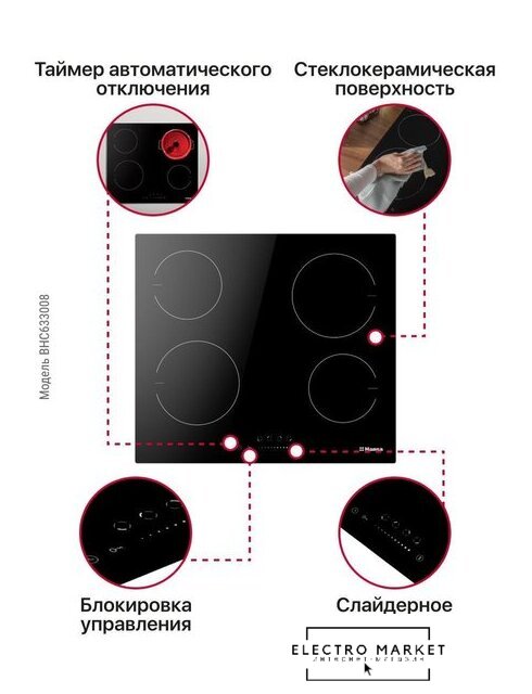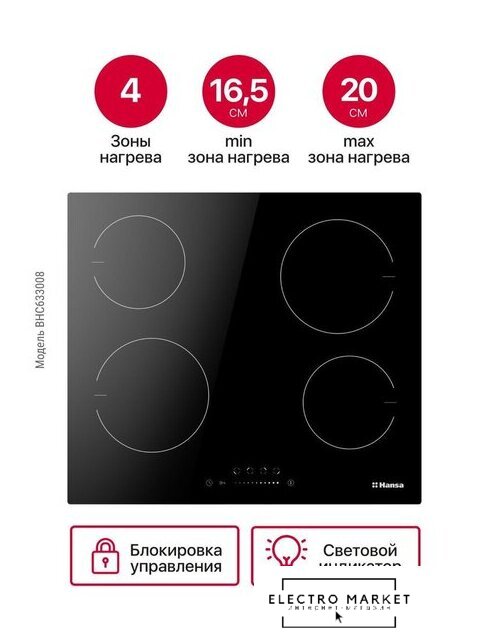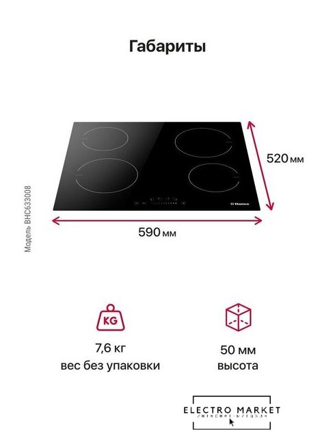 HiLight на 4 конфорки, cтеклокерамика, мощность: 6600 Вт, независимая установка, размеры (ШхГ): 59x52 см
