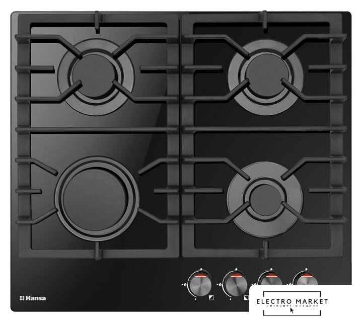 газовая на 4 конфорки, закаленное стекло, мощность: 8300 Вт, автоматический электроподжиг, газ-контроль, решетки: чугун
