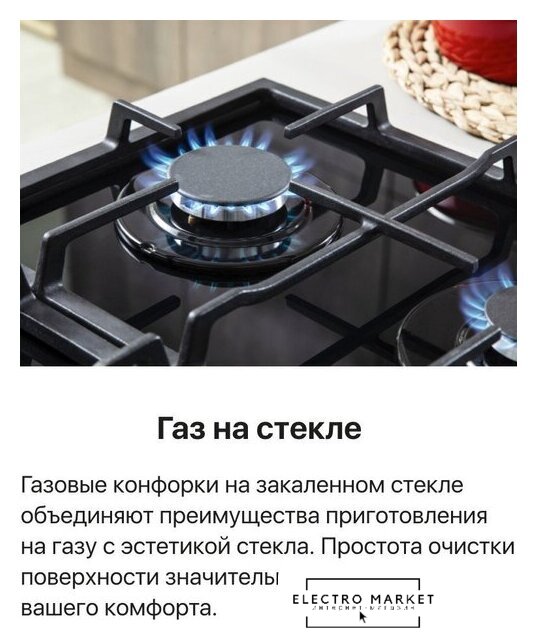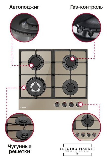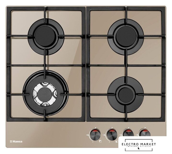 газовая на 4 конфорки, закаленное стекло, мощность: 9100 Вт, автоматический электроподжиг, газ-контроль, решетки: чугун, независимая установка, размеры (ШхГ): 59x51.5 см