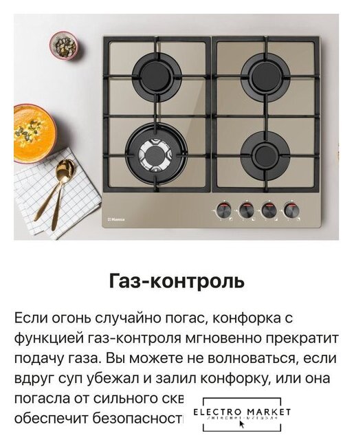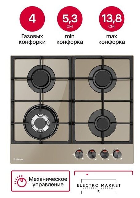 газовая на 4 конфорки, нержавеющая сталь, мощность: 8300 Вт, автоматический электроподжиг, газ-контроль, решетки: чугун, независимая установка, размеры (ШхГ): 58x51 см