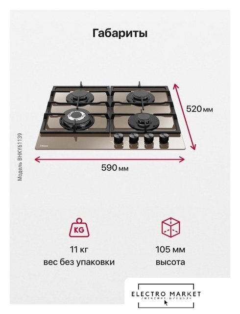 газовая на 4 конфорки, закаленное стекло, мощность: 7650 Вт, автоматический электроподжиг, газ-контроль, решетки: чугун, независимая установка, размеры (ШхГ): 58.5x51 см