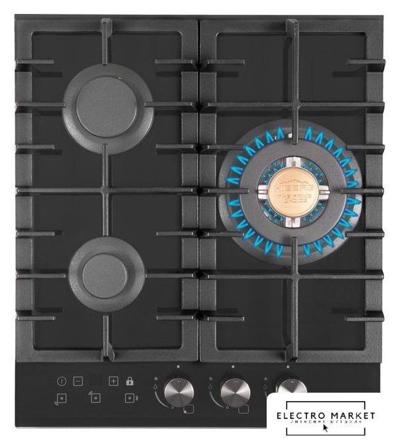 газовая на 3 конфорки, закаленное стекло, мощность: 5750 Вт, автоматический электроподжиг, газ-контроль, решетки: чугун, независимая установка, размеры (ШхГ): 45x52 см