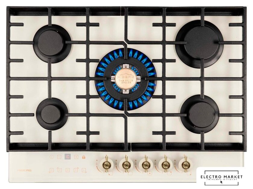 газовая на 5 конфорок, закаленное стекло, мощность: 10400 Вт, автоматический электроподжиг, газ-контроль, решетки: чугун, независимая установка, размеры (ШхГ): 87.4x51 см