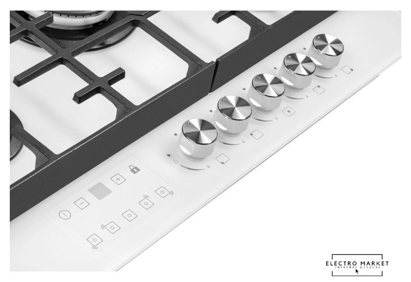 газовая на 5 конфорок, закаленное стекло, мощность: 10700 Вт, автоматический электроподжиг, газ-контроль, решетки: чугун, независимая установка, размеры (ШхГ): 68.4x51 см