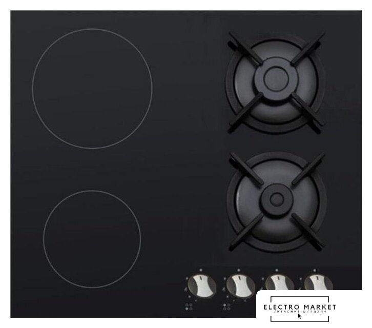 HiLight + газ на 4 конфорки, cтеклокерамика, мощность: 6400 Вт, автоматический электроподжиг, газ-контроль, решетки: чугун, независимая установка, размеры (ШхГ): 59x51.5 см