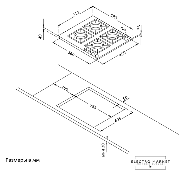 газовая на 4 конфорки, нержавеющая сталь, мощность: 7500 Вт, автоматический электроподжиг, газ-контроль, решетки: чугун, независимая установка, размеры (ШхГ): 58.2x52 см