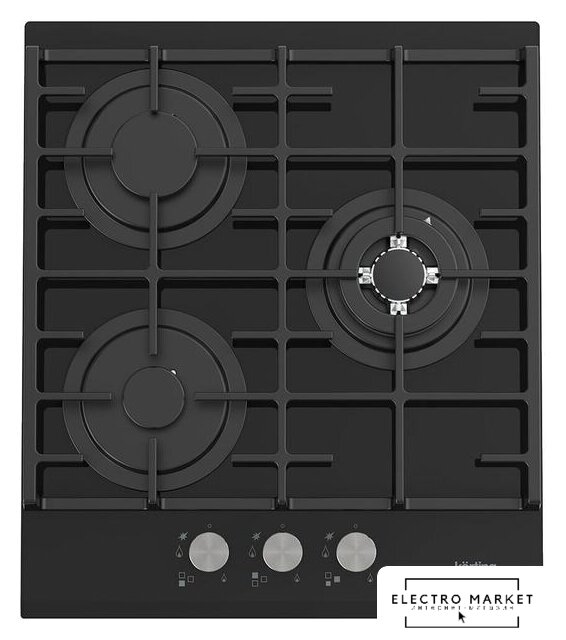 газовая на 3 конфорки, закаленное стекло, мощность: 6450 Вт, автоматический электроподжиг, газ-контроль, решетки: чугун, независимая установка, размеры (ШхГ): 46x52 см