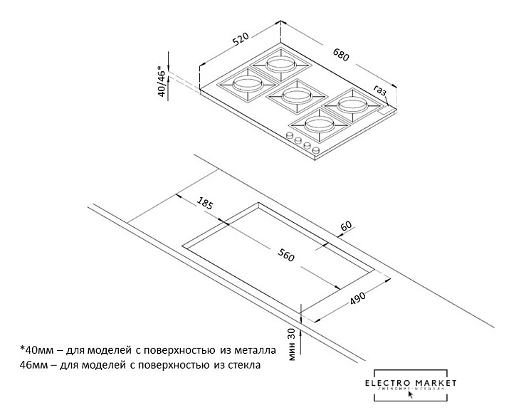 газовая на 4 конфорки, закаленное стекло, мощность: 8300 Вт, автоматический электроподжиг, газ-контроль, решетки: чугун, независимая установка, размеры (ШхГ): 58x51 см