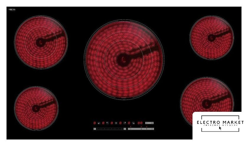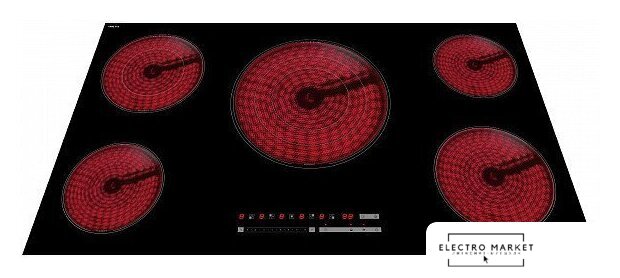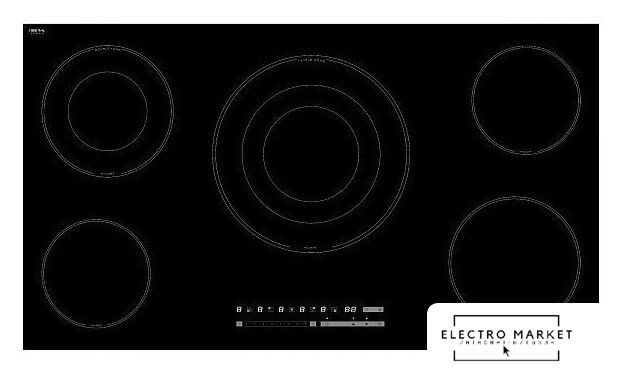 | Подробная информация о конфорках | Левая дальняя конфорка - 200 мм, 2.0-1.0 кВт; левая ближняя конфорка - 165 мм, 1.2 кВт; правая дальняя конфорка - 165 мм, 1.2 кВт; правая ближняя конфорка - 200 мм, 1.8 кВт; центральная конфорка - 300 мм, 2.7/1.75/0.95 кВт (тройная зона) |