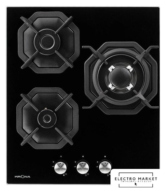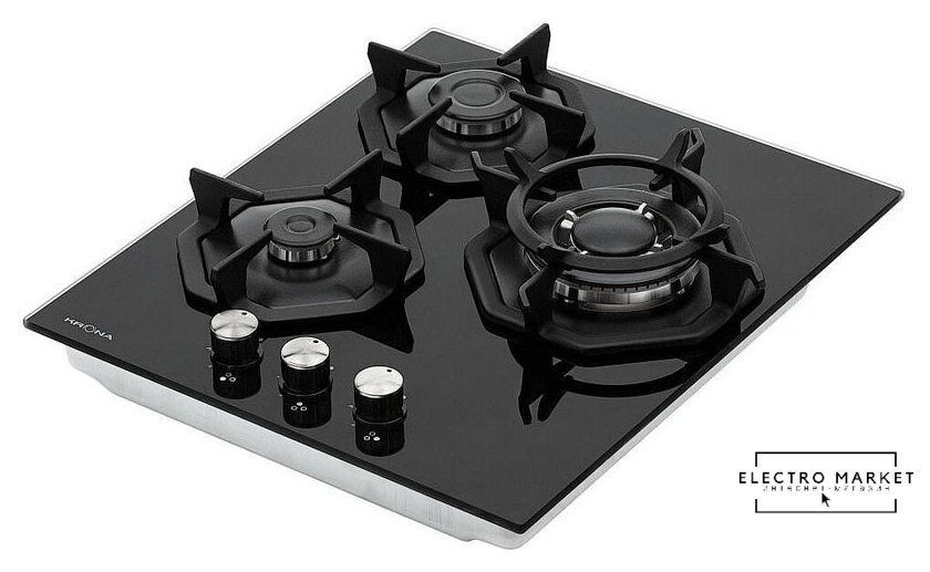 газовая на 3 конфорки, закаленное стекло, мощность: 6250 Вт, автоматический электроподжиг, газ-контроль, решетки: чугун, размеры (ШхГ): 45x51 см