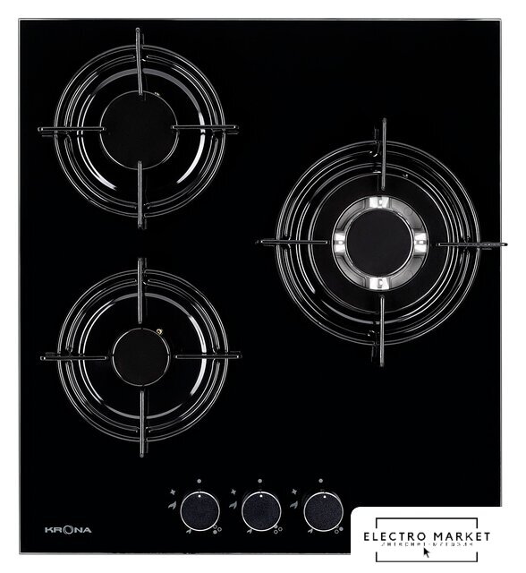 газовая на 3 конфорки, закаленное стекло, мощность: 6400 Вт, автоматический электроподжиг, газ-контроль, решетки: чугун, независимая установка, размеры (ШхГ): 45x52 см