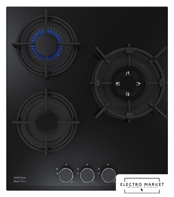 газовая на 3 конфорки, закаленное стекло, мощность: 5950 Вт, автоматический электроподжиг, газ-контроль, решетки: чугун, независимая установка, размеры (ШхГ): 45x52.5 см