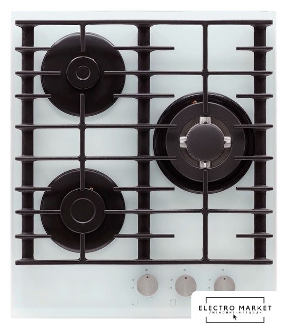 газовая на 3 конфорки, закаленное стекло, мощность: 6450 Вт, автоматический электроподжиг, газ-контроль, решетки: чугун, независимая установка, размеры (ШхГ): 46x52 см