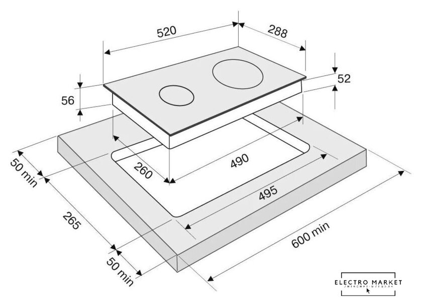 индукционная на 2 конфорки, cтеклокерамика, мощность: 3600 Вт, независимая установка, размеры (ШхГ): 28.8x52 см