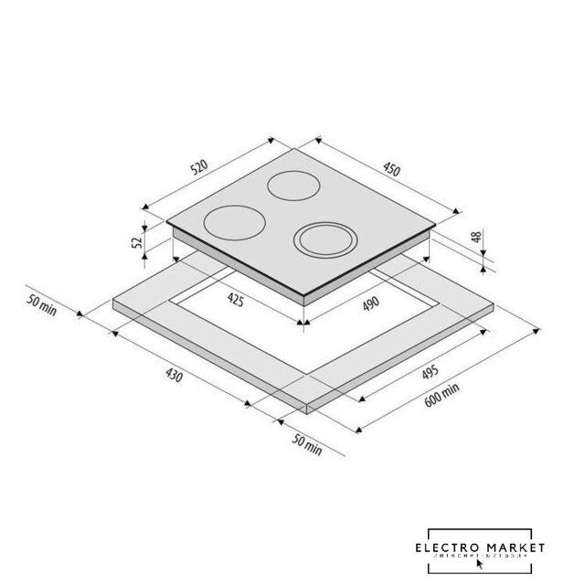 HiLight на 3 конфорки, cтеклокерамика, мощность: 4200 Вт, независимая установка, размеры (ШхГ): 45x52 см