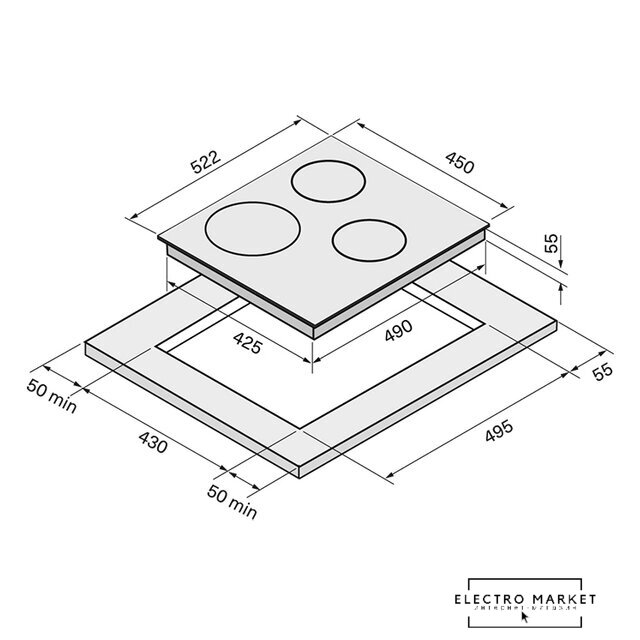 Подробная информация о конфорках | Дальняя левая: 160 мм * 1,3/1,5 кВт;Ближняя левая: 210 мм * 2,3/2,6 кВт;Центральная правая: 160 мм * 1,3/1,5 кВт |
