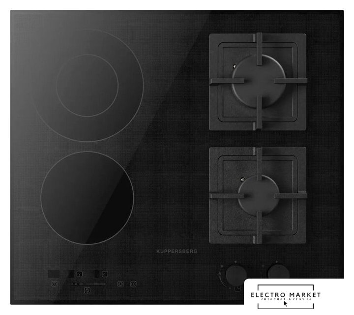 HiLight + газ на 4 конфорки, cтеклокерамика, автоматический электроподжиг, газ-контроль, решетки: чугун, независимая установка, размеры (ШхГ): 58.5x51 см