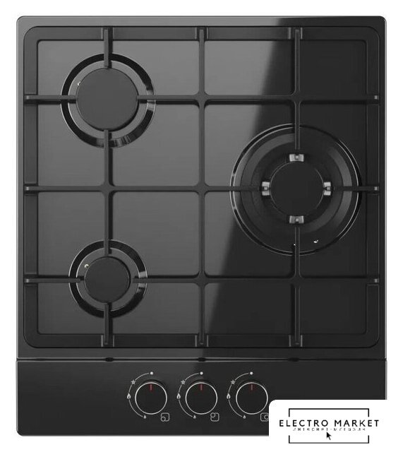 газовая на 3 конфорки, закаленное стекло, мощность: 5850 Вт, автоматический электроподжиг, газ-контроль, решетки: чугун, независимая установка, размеры (ШхГ): 73.3x50 см